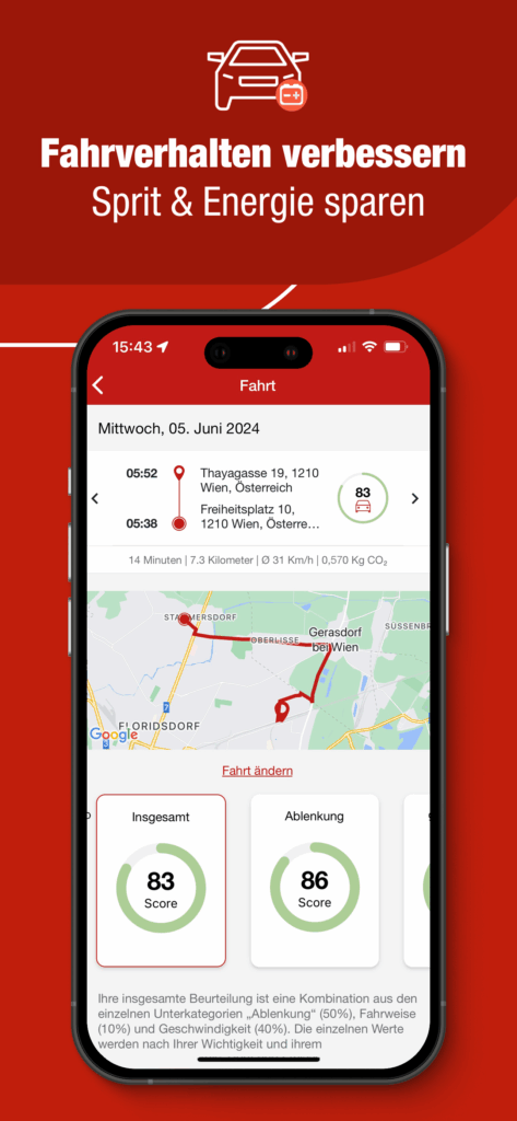 • Driving behavior scoring with clear weighting (speed, distraction, driving style)