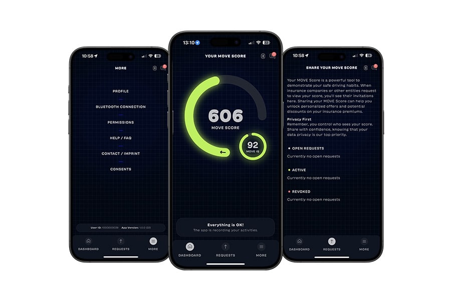No hardware. No OBD dongles. No lengthy setup. The driver uses a smartphone app – either the standalone MOVE Score App or a white-label app built on MOVE SDK. The score is computed and transmitted privately.